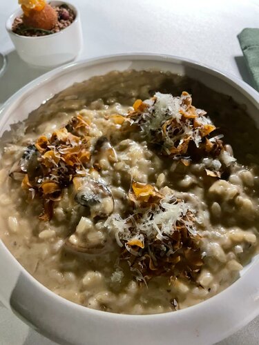Прекрасное орсотто с крабом, томатный суп с морепродуктами.
